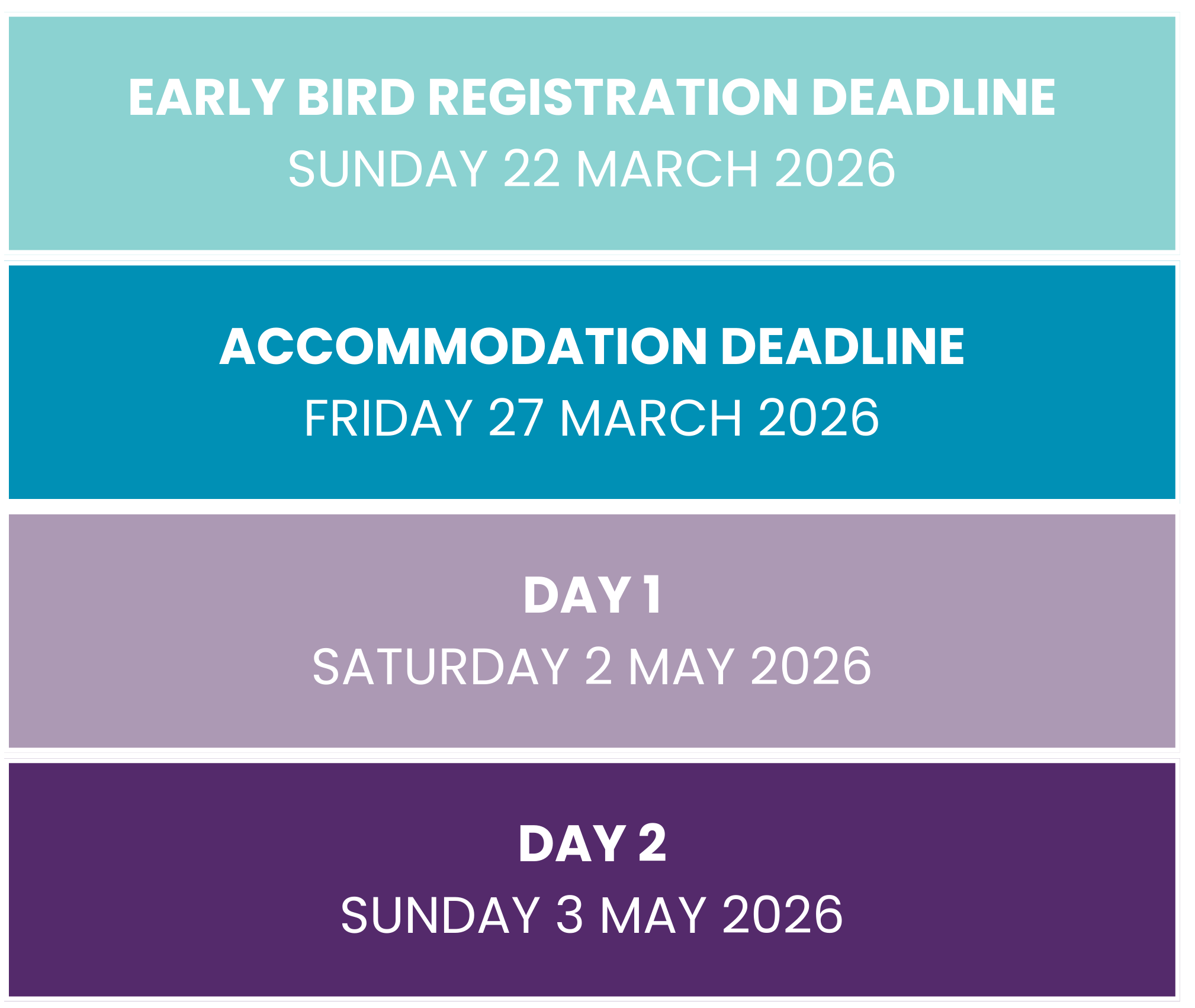 If you choose to pay via bank transfer, you will be sent an invoice upon submitting your registration, and full payment must be made within 30 days of registering. Your registration is not confirmed until full payment is made. If you register during a period of discounted or early bird rate, you must ensure that payment is made before the discounted period ends, otherwise the next cost level will apply.